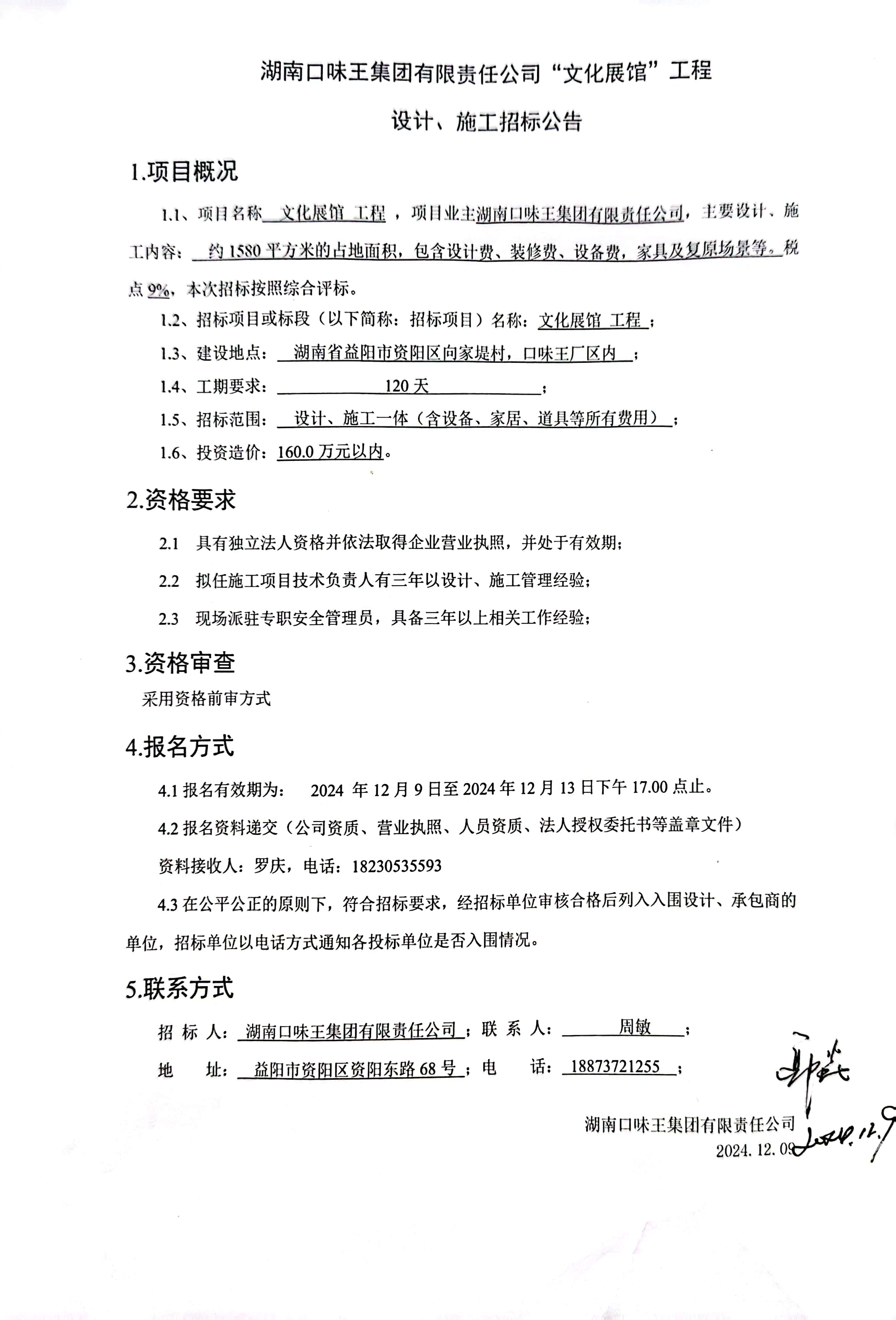 湖南口味王集团有限责任公司“文化展馆”工程设计、施工招标文件